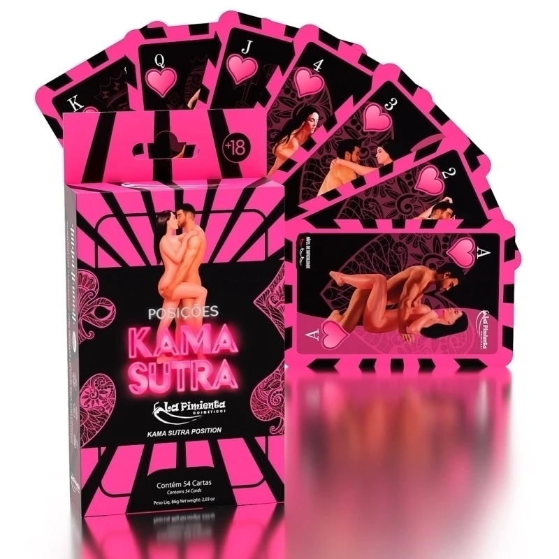 Baralho Kama Sutra La Pimimenta possui 54 cartas com imagens de sexo soft (não explicito).